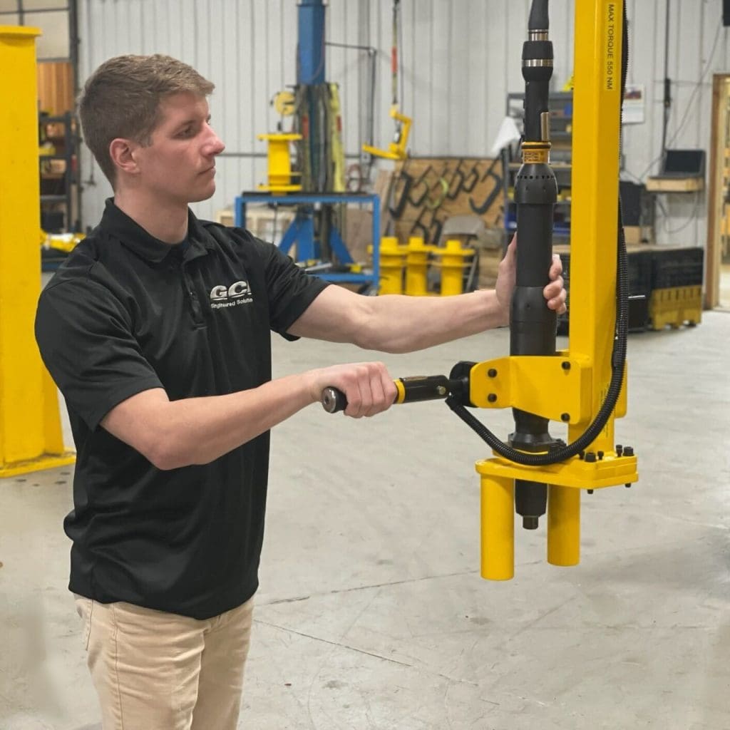 GCI engineered a custom interface that keeps the clutch still while the tool can properly fasten the ring. Dual load balancers help the operator to easily move the tool without the need for control buttons.