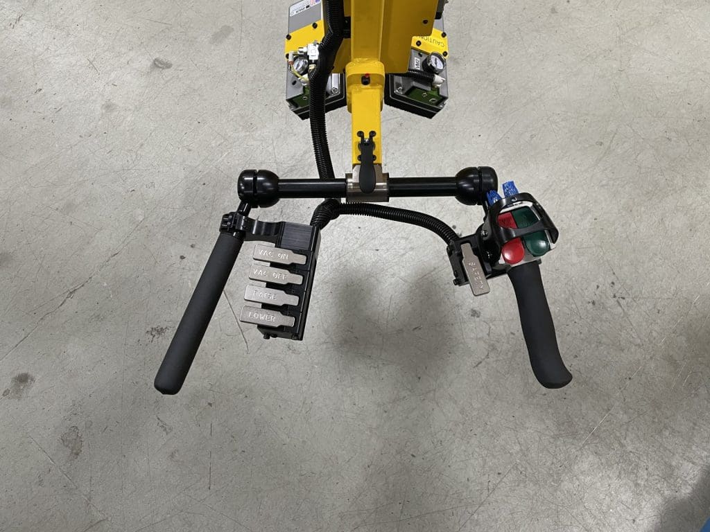 GCI engineered a custom end-of-hook handling solution with special vacuum pads for the gripper to safely handle the material rolls. The pads contain several small holes instead of one large suction cup like our standard vacuum grippers. This design allows for gripping irregular or perforated surfaces while still maintaining an air-tight seal.
