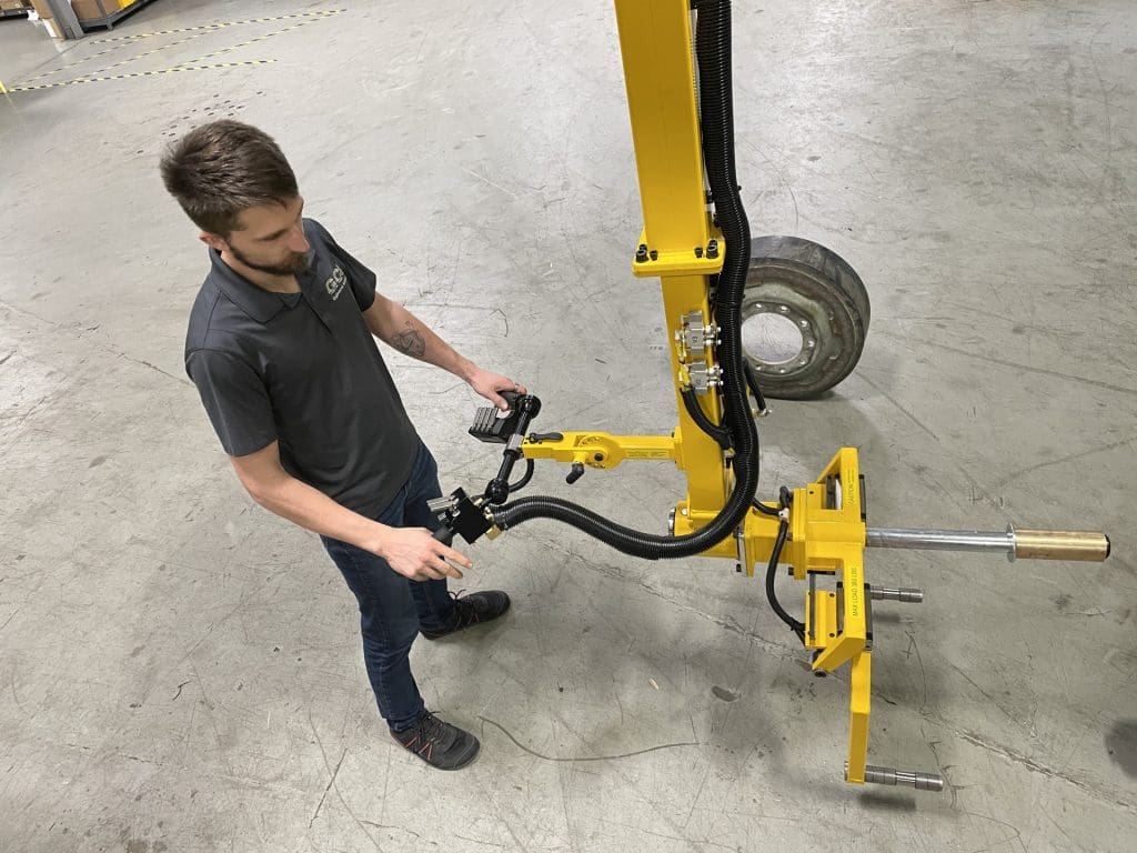 GCI Engineered Solutions operator showing their custom tire manipulator in use