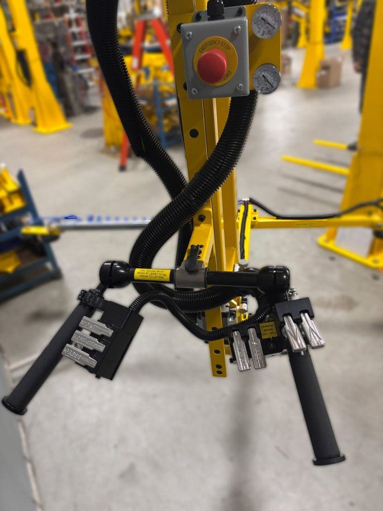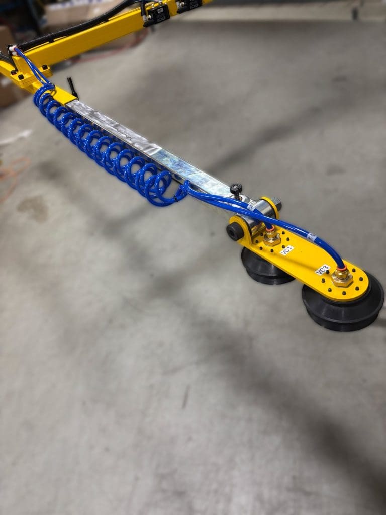 - Telescoping Crossbar: The gripper includes a telescoping crossbar that adjusts the suction cup width, providing versatility for varying bumper sizes. This feature is complemented by coiled poly tubes to avoid kinks that would prevent air flow at different gripper lengths.