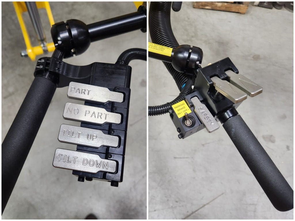 GCI designed an industrial manipulator arm with an inner diameter probe and powered pitched tilt. The probe has two different diameter sizes (3″ and 6″) with lugs to grip multiple sizes of rolls strongly. To avoid accidental release of a roll, the operator must press a two-button release mechanism.