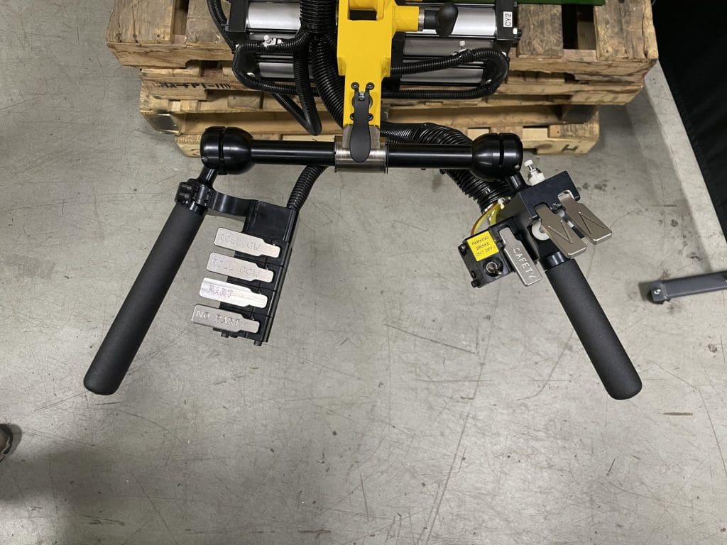 GCI engineered a manipulator arm with a custom end effector to safely and reliably handle this sub-assembly. The end effector contains two probes to help line up the part so the gripper can properly engage. The intuitive controls make it simple to control the vertical travel of the arm, grip the part and initiate the power rotation. Both the safety and the “no part” levers need to be activated to release the part. The 2-lever requirement acts as a redundancy to reduce the chance of dropping the part.