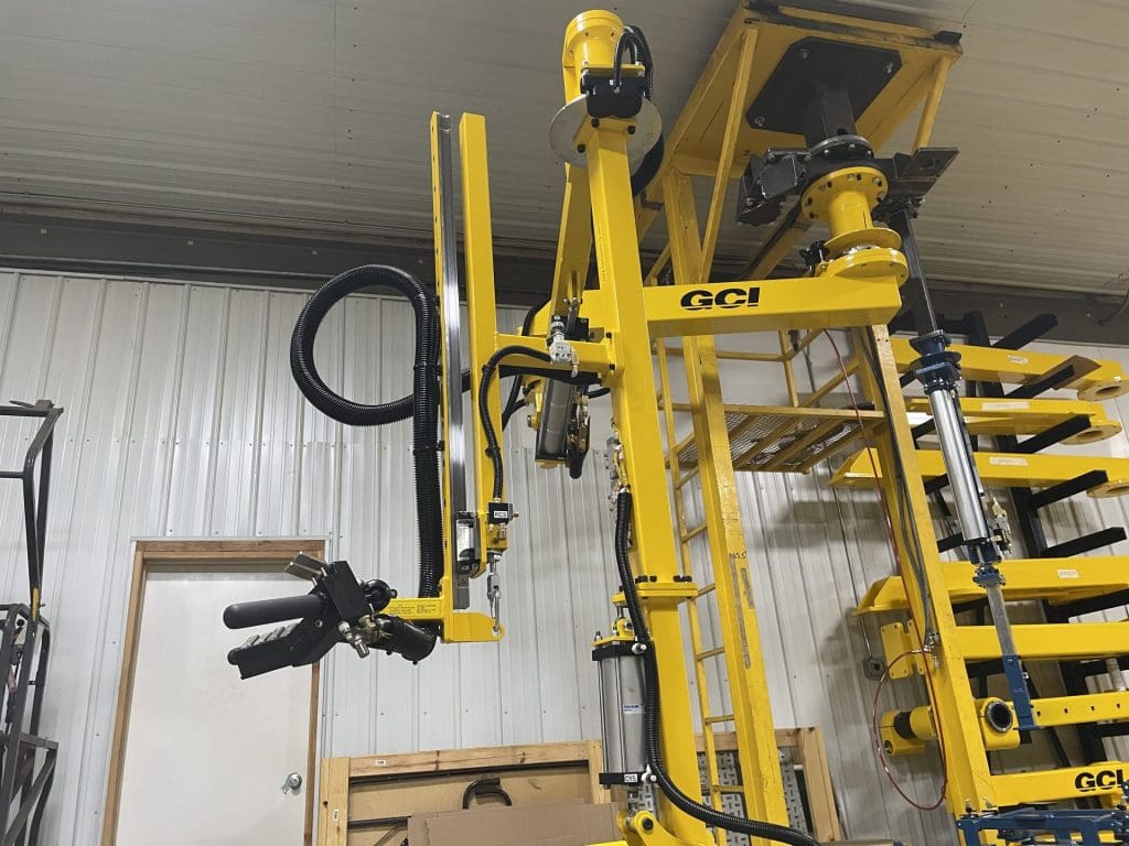 GCI designed an overhead-mounted manipulator with a custom end effector and powered tilt to safely pick and place tires up to 75 lbs. To further enhance safety, a two-handed lever control reduces the chances of inadvertently dropping the tire. To improve ergonomics, the linear balance handle helps keep the controls at the ideal waste height for the operator.