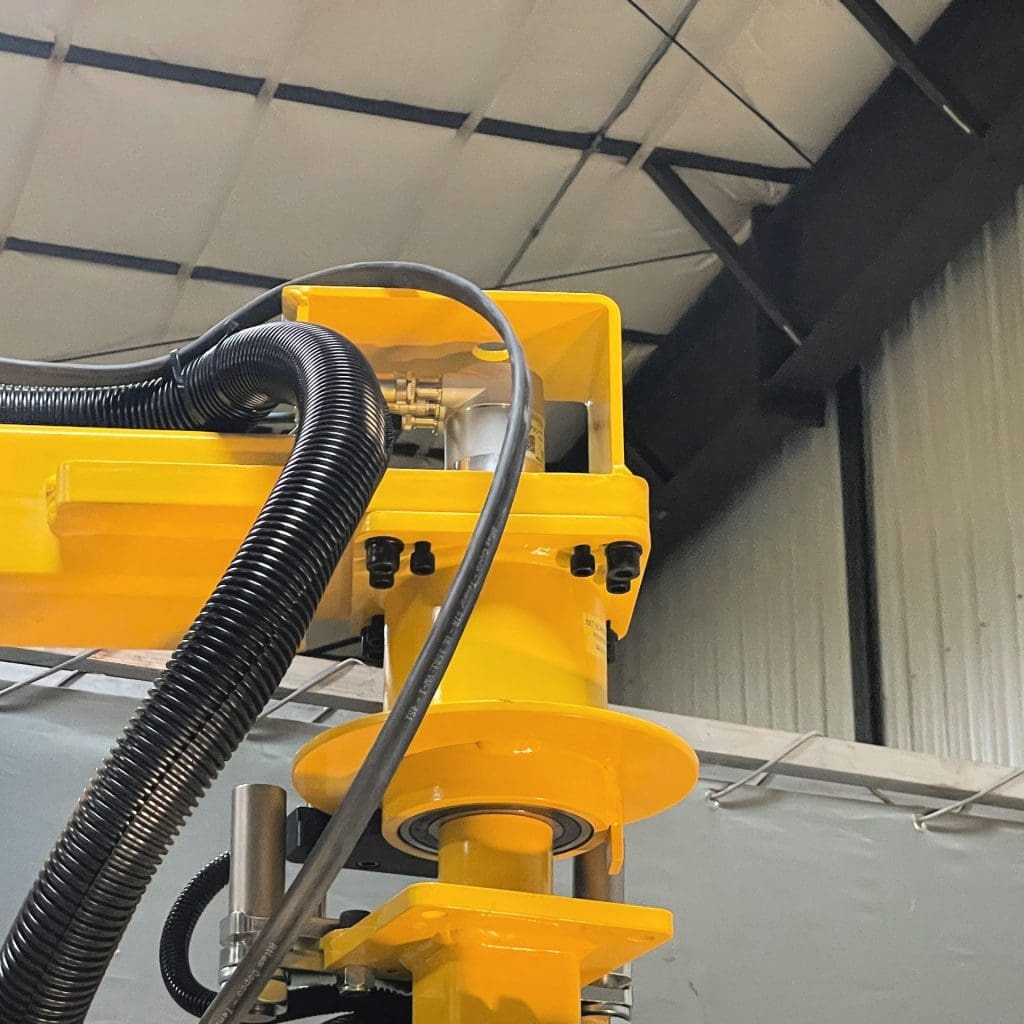 To help with safety, a load balancing system and discrete brake were included in the solution. The load balancing feature cancels out the arm and tool weight to make positioning easy for the operator. When the tool is in position, the discrete brake locks up the arm to absorb the reactive torque forces.