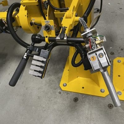 The client requested a single system to handle multiple steps of tire fender assembly and installation. This system is capable of picking up three different styles of fenders, lifting them off the ground, and rotating them up to 270° to allow an operator to assemble components on the underside. It then rotates back and lifts the part to the installation position. The system has an automatic rotation stop to prevent the fender from rotating into the ground at lower heights and at higher heights, there are adjustable stops to aid the operator in getting the correct orientation during installation.